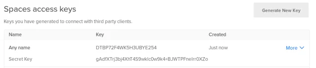 And scroll down to the “Spaces access key” section (in this screenshot, you can see one that is already created, but you may not have that):